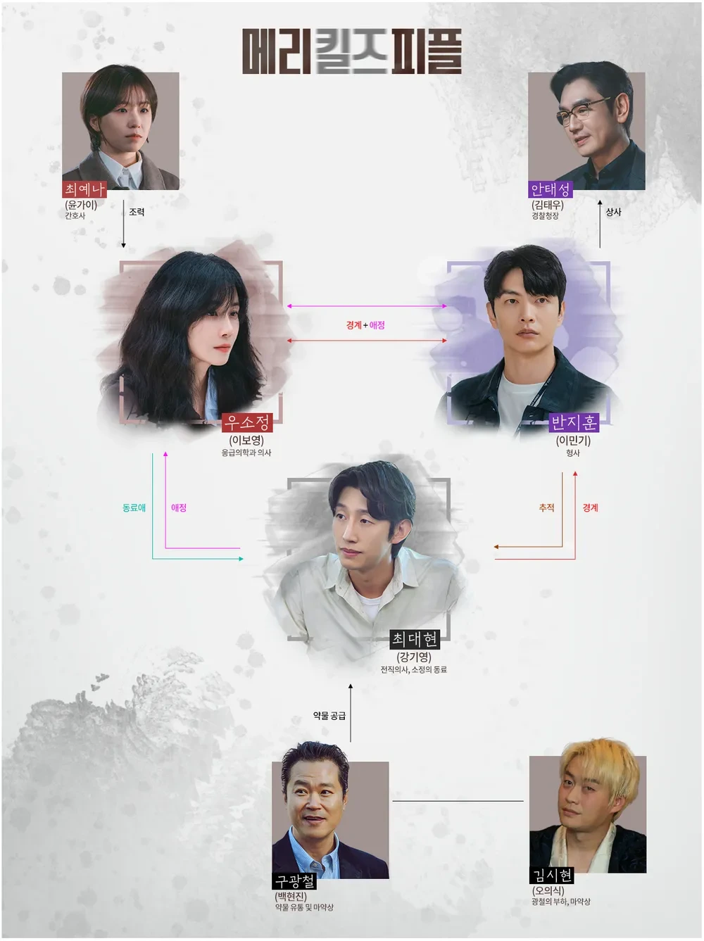 메리킬즈피플의 인물관계도는 복잡하지만 흥미롭습니다. 우소영과 최대현은 환자들의 죽음을 돕는 "동업자" 관계이며, 반지훈은 이들을 연쇄살인범으로 규정하고 추적하는 형사입니다. 이 세 인물의 얽힌 관계는 극의 주요 갈등을 형성하며 앞으로의 전개에 큰 영향을 미칠 것입니다. 특히 반지훈과 우소영의 만남은 나중에 중요한 전환점이 될 것으로 보입니다. 이러한 관계는 시청자들에게 긴장감을 제공하고, 드라마의 몰입도를 높이는 요소로 작용할 것입니다.